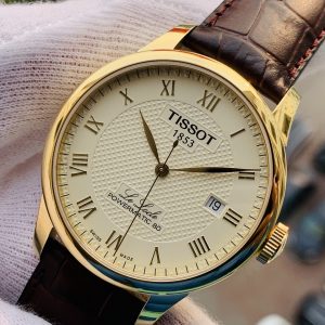 Bộ kim lá liệu tinh xảo với các cọc số la mã đậm chất cổ điển. Tên thương hiệu Tissot và dòng sản phẩm Le Locle được in sắc nét ngay phía trên mặt đồng hồ.